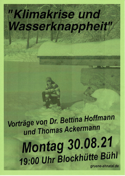 Mit Blick auf die Bundestagswahl laden die Ahnataler Grünen für Montag, den 30. August 2021, um 19.00 Uhr ein zum Thema „Klimakrise und Wasserknappheit“.